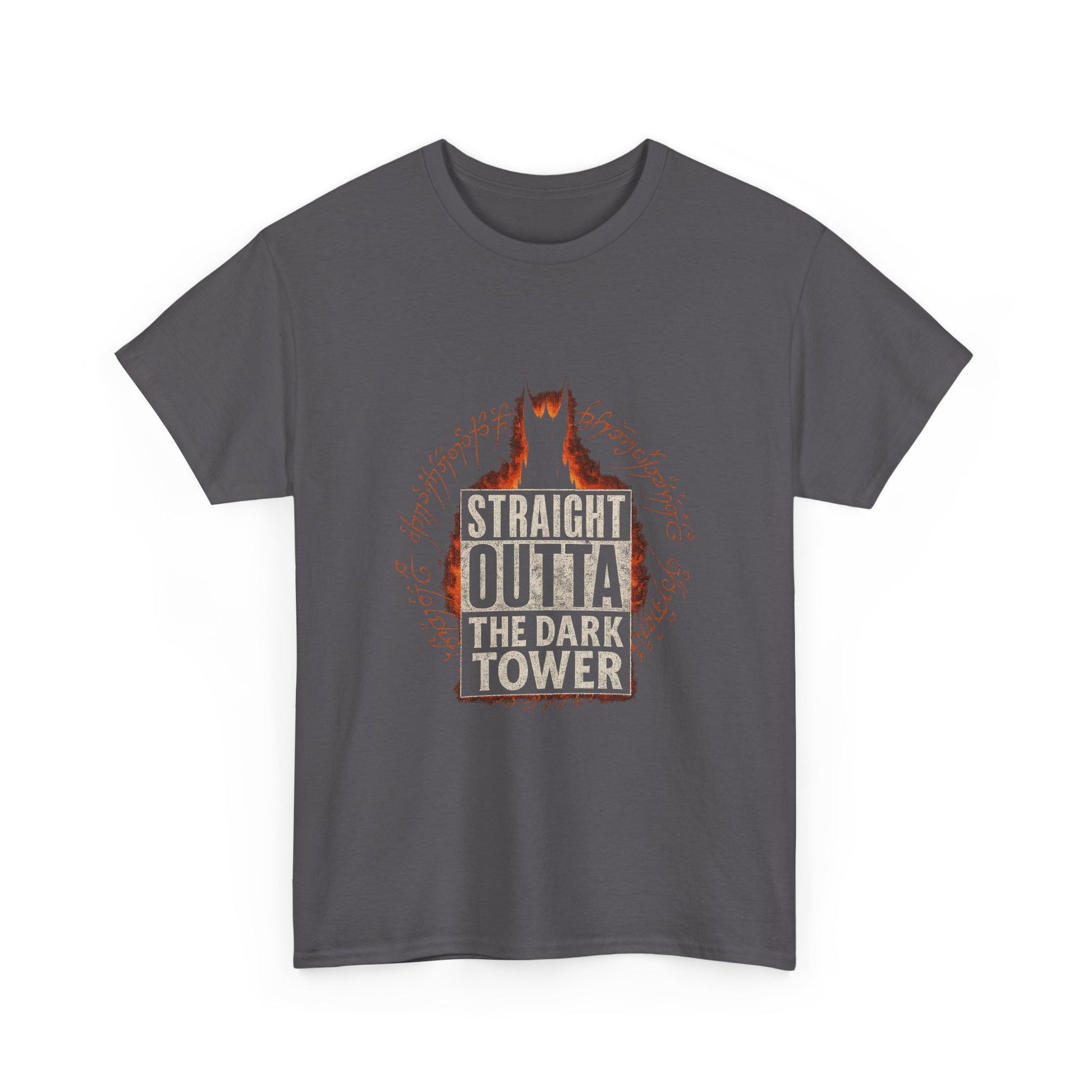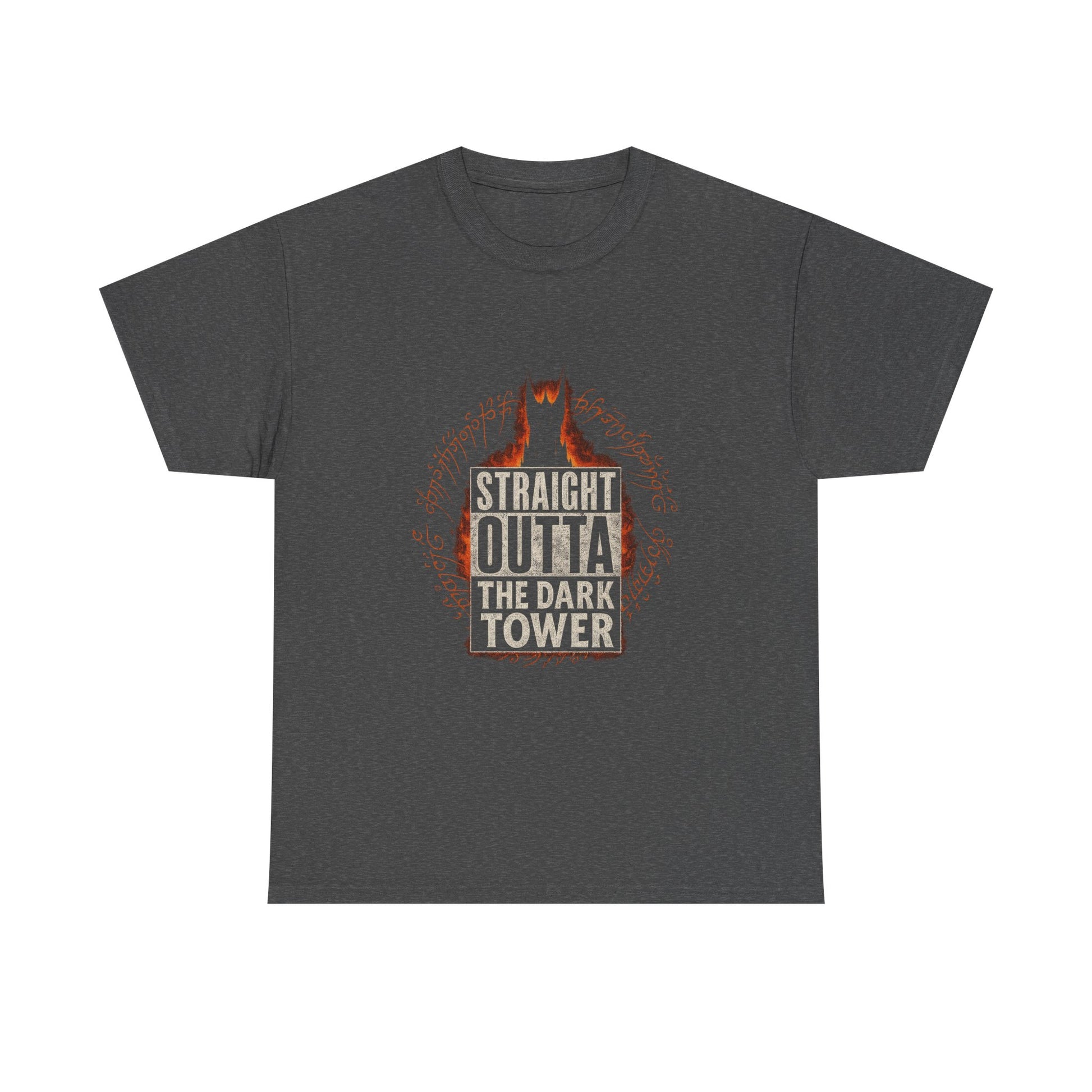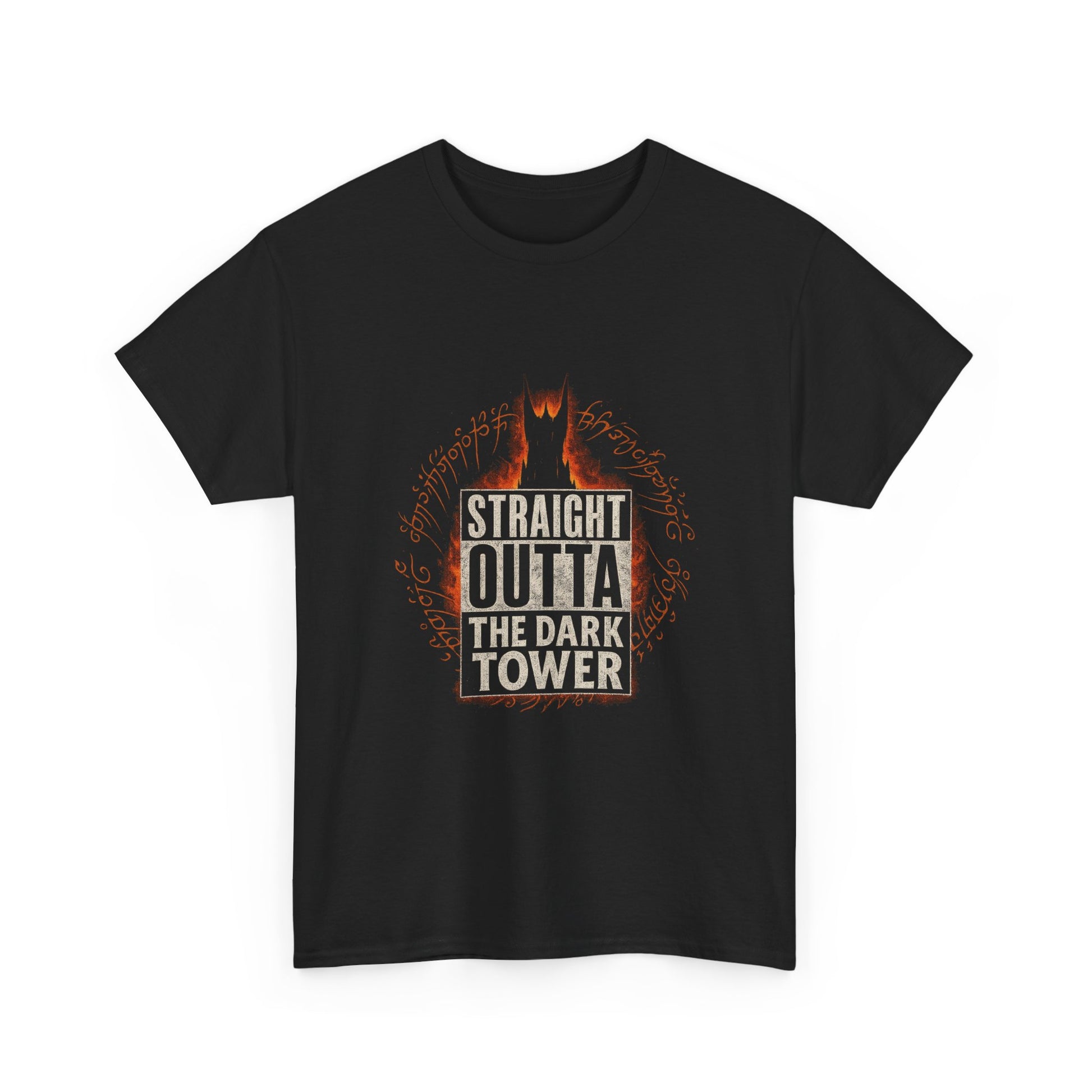 The “Straight Outta the Dark Tower” Heavy Cotton Tee delivers a bold, dark aesthetic for those who live on the edge of fantasy and metal. Featuring distressed block lettering with a fiery tower silhouette and arcane runes, this shirt channels pure dark-lord energy with a clever parody twist.